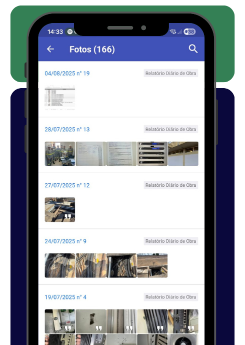 Com o aplicativo Diário de Obra, o registro é feito de forma padronizada e rastreável, garantindo transparência total na execução e agilidade na tomada de decisões.